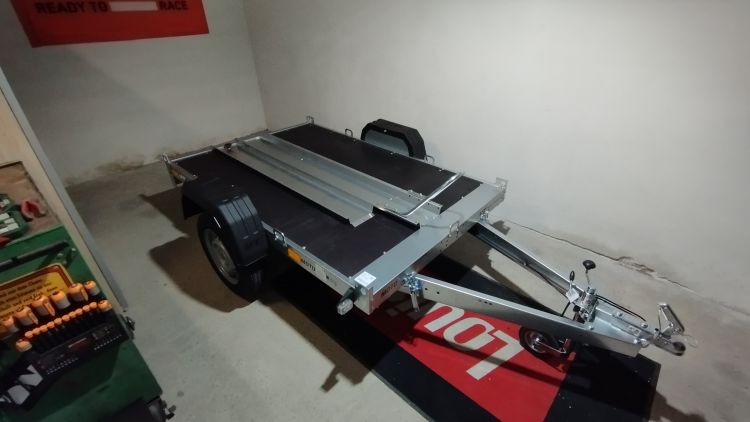 Zur Ausstattung des Anhängers gehören eine praktische Rampe, eine Führung und eine Vorderradstütze. Der Anhänger ist außerdem mit einem Stützrad ausgestattet, das ein bequemes Manövrieren ermöglicht, wenn er nicht an ein Fahrzeug angeschlossen ist.